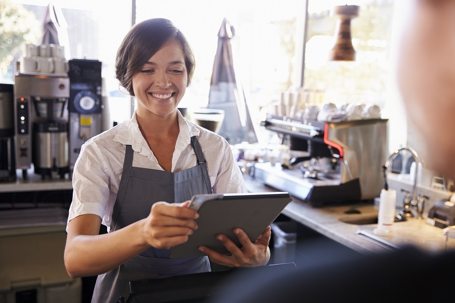 Cashier Takes Card Payment From Customer With Digital Tablet