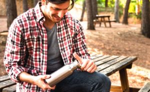 Reusable water bottle held by a man, to avoid the use of plastic